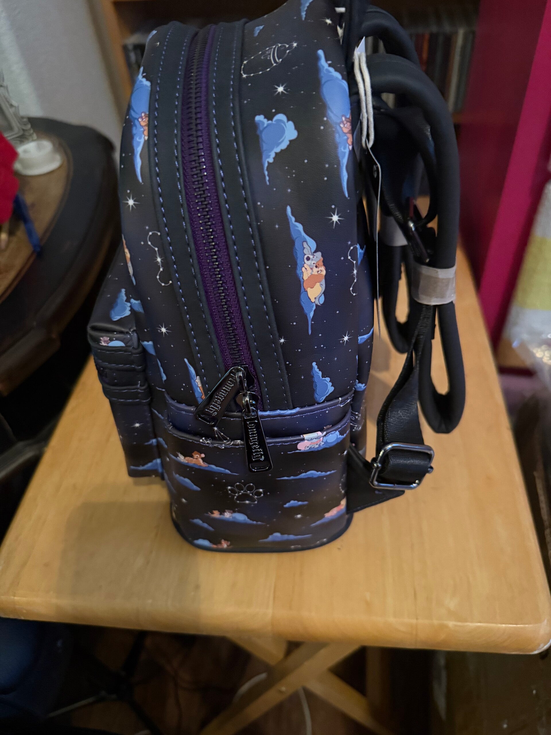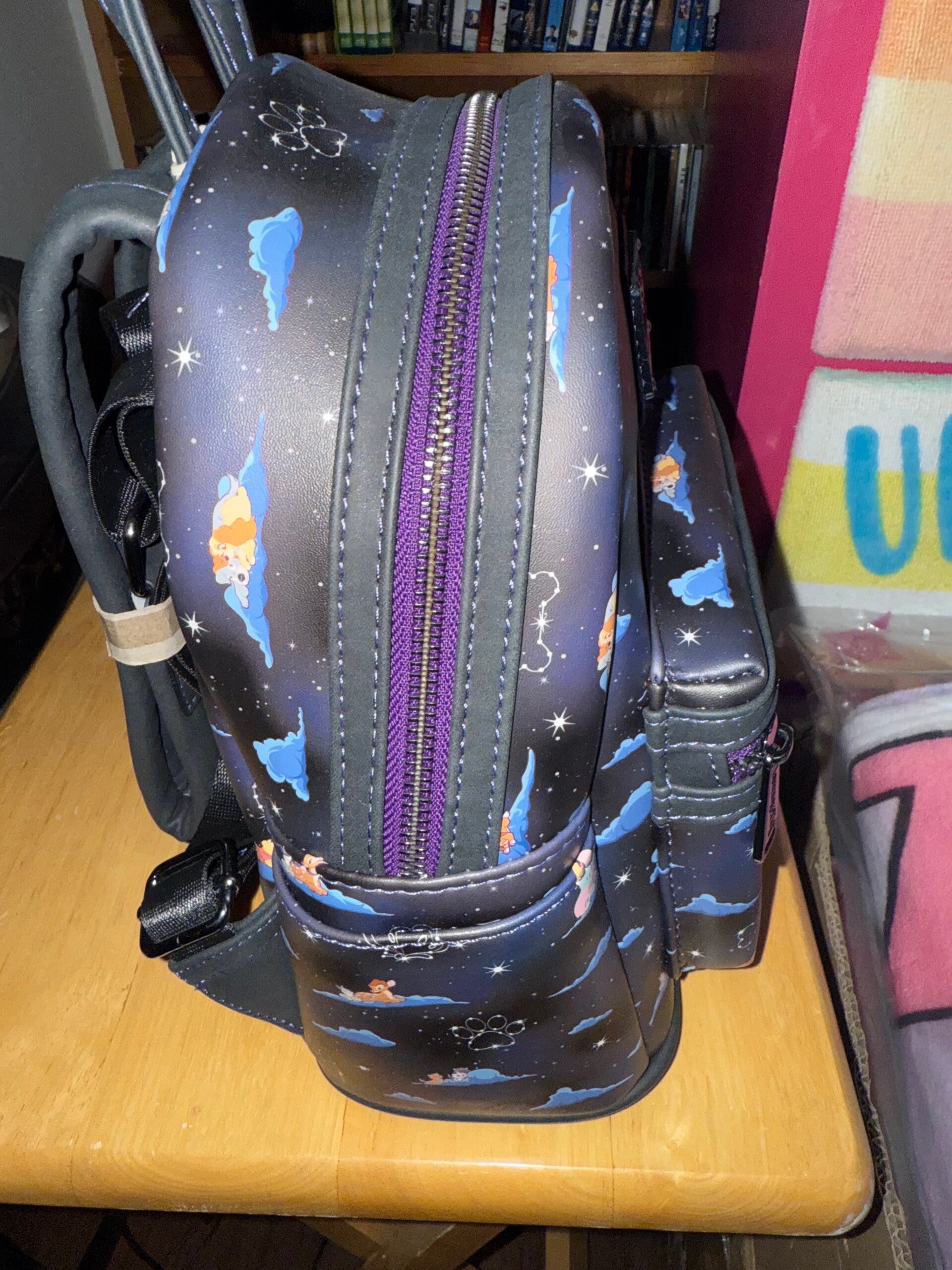 This officially licensed Disney bag features a dark, starry night sky with blue clouds and classic Disney characters from various movies (including Bambi, Dumbo, The Aristocats, Winnie the Pooh, and The Fox and the Hound) looking at constellations.