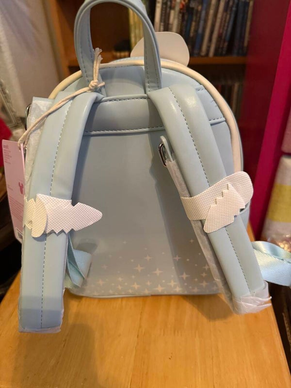 This mini backpack features an appliqué of Cinderella in her ballgown amid a giant pumpkin. The pumpkin section opens up to reveal a print of Jaq and Gus, the mouse friends from the movie.