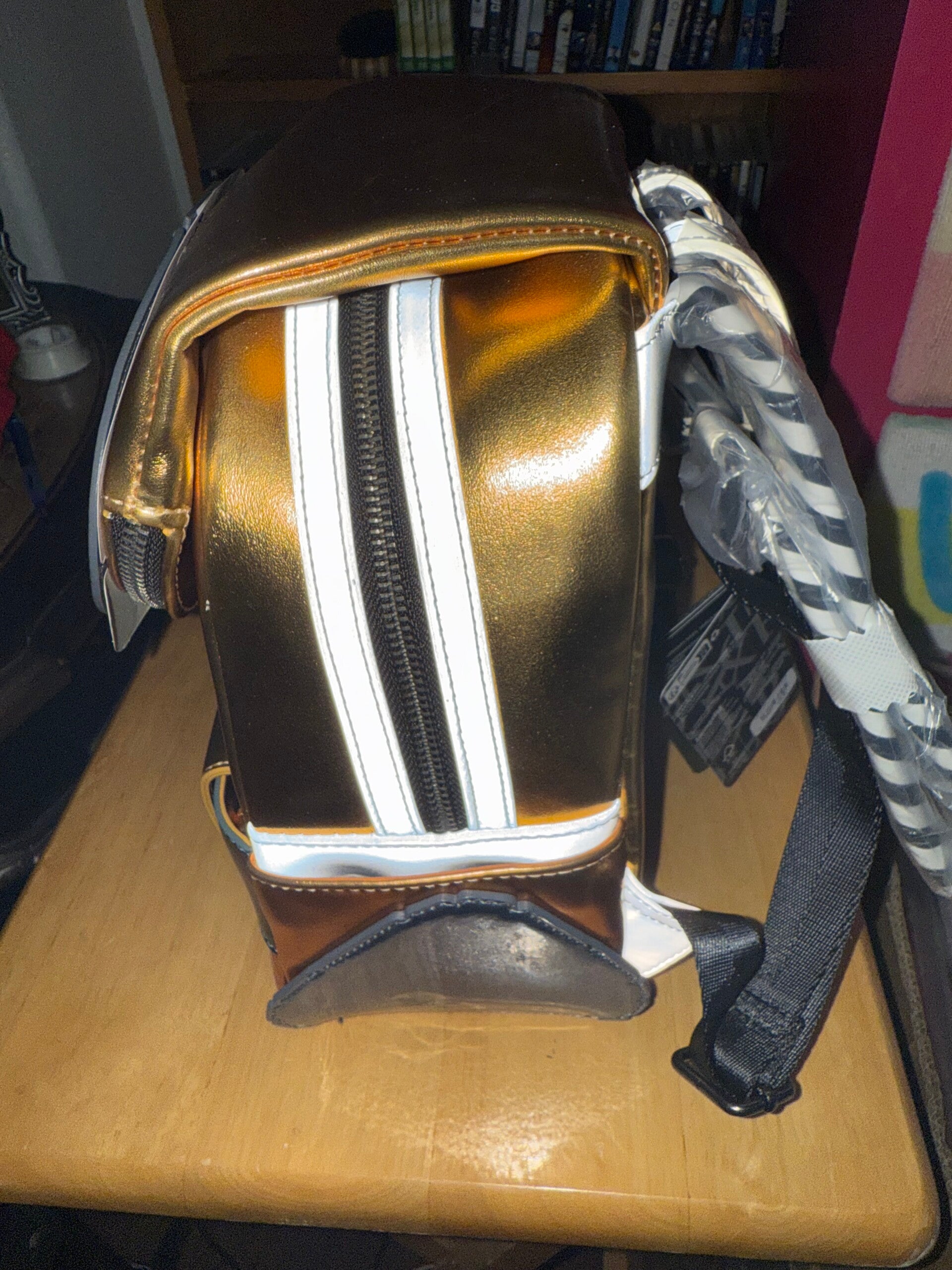 This bag is shaped like WALL-E's head and eyes, with the front flap featuring matching metal badge details. It is made of vegan leather and includes an adjustable shoulder strap and sturdy metal hardware. The design often includes applique and debossed details, with a coordinating inner lining fabric.