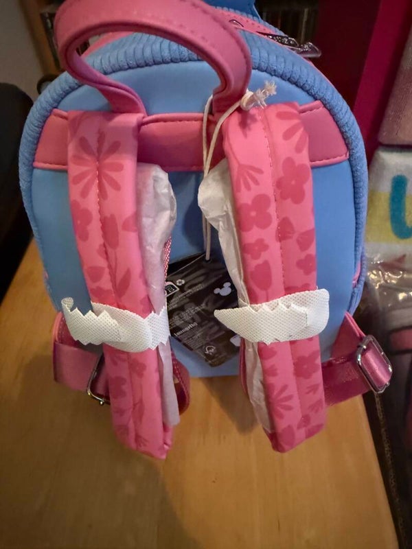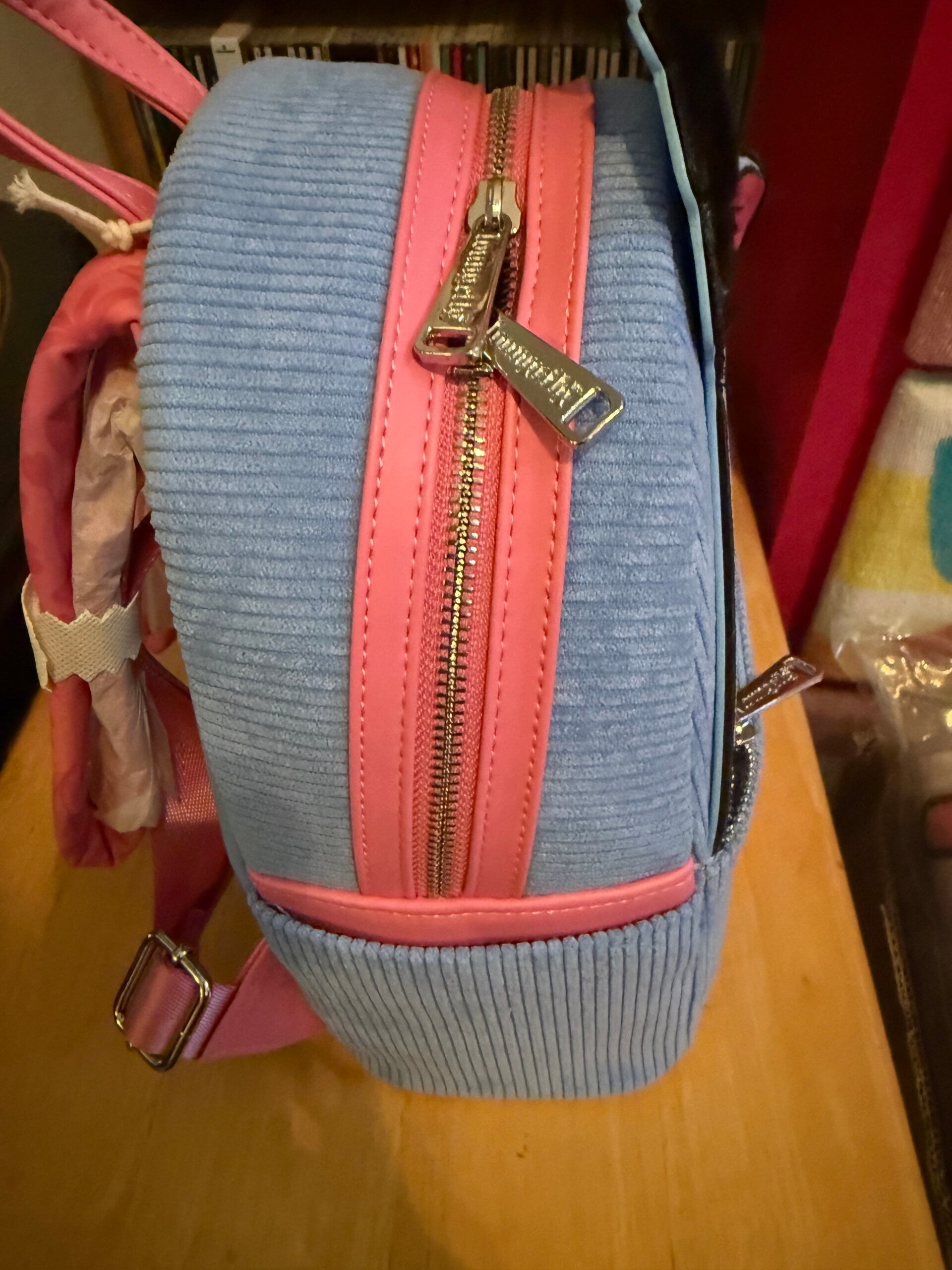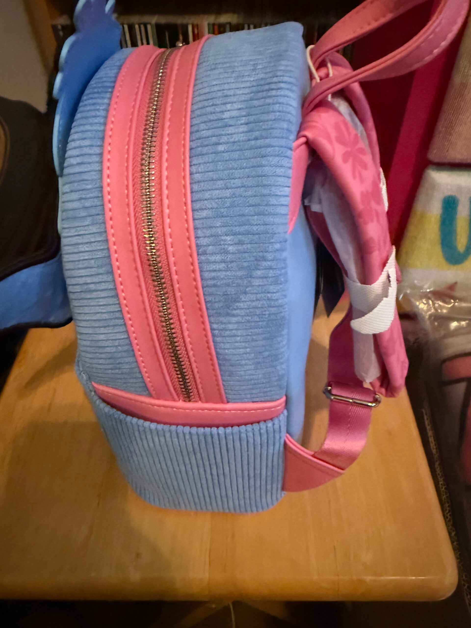 This is a mini backpack featuring the character Eeyore from Winnie the Pooh. It has a corduroy body, a magnetic ear design, a 3D bow, and embroidered and faux fur details for Eeyore's mane. It features a semi-circle shape with a zip closure and silver hardware.