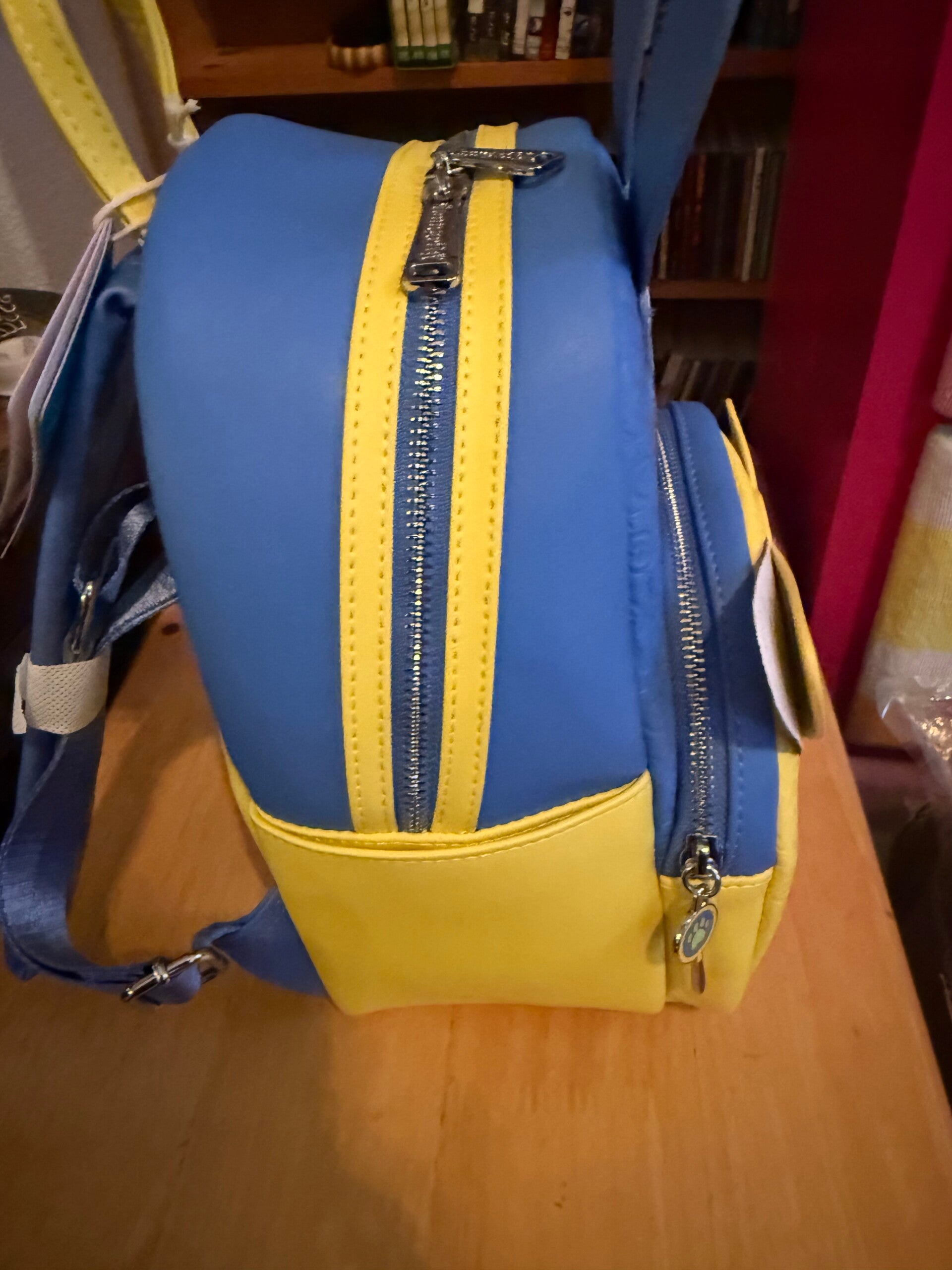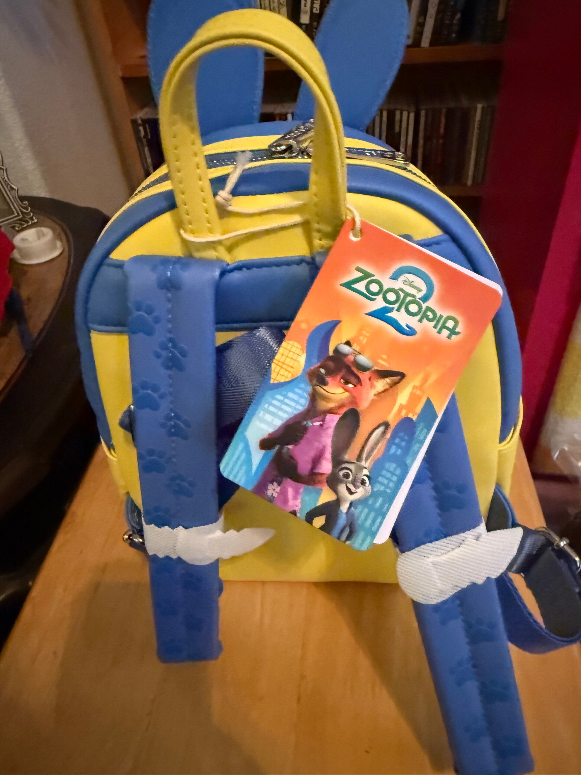 This mini backpack is made from faux leather and features stacked appliqués of Nick Wilde and Judy Hopps on a debossed body. The top section is blue with a character pattern, featuring Judy Hopps' ears extending above the bag. The bottom front pocket is yellow, featuring Nick Wilde's face and ears. It includes a zip closure and adjustable shoulder straps.